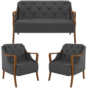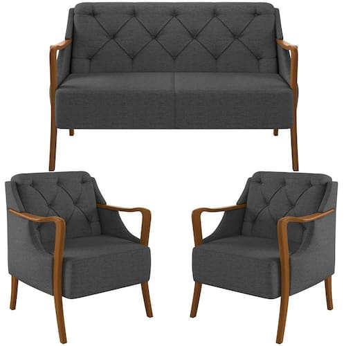 Kit Sofá 02 Lugares Sala Estar 135cm Com 02 Poltronas Coral Pés Madeira M03 Linho Chumbo - Lyam Decor O Kit de sofá com poltrona Coral promete marcar com elegancia e versatilidade á presença em diversos estilos de decoracao. O modelo certo é essencial para o bom funcionamento dos cômodos da casa, por isso, um sofá bem estruturado é mais do que necessário na sala de estar! O design aconchegante se destaca junto aos pés madeirados e o revestimento em Linho! Extremamente elegante, que transmite a nobreza que ele precisa! Tudo isso para gerar conforto para você e sua família em uma peça única feita com todo cuidado e observada nos detalhes para superar as suas expectativas! Adquira o seu! Dimensões do Sofá (L x A x P) 135 x 88 x 78 cm Dimensões da Poltrona (L x A x P) 75 x 88 x 78 cm Características: Estrutura em madeira de reflorestamento, imunizada contra mofo. Revestimento em Linho na cor Chumbo. Sustentação do assento com cintas elásticas de alta resistência. Encosto fixo D-26 com manta acrílica, assento com espuma D-26. Suporta até 120 kg por assento. Tela de ráfia. Pés e braços em Madeira Tingidos. - Por se tratar de estofado as medidas podem ter uma pequena variação de até 3 cm. - A tonalidade do produto real poderá ter ligeira variação devido o lote de tecidos. Produto entregue montado. Indicado para residencial, sua limpeza deve ser feita com pano umedecido em água limpa, sem esfregar, não utilizar produtos abrasivos, desengordurantes, álcool ou solvente. Nunca sentar nos braços ou encosto do produto. Manter em lugar livre de umidade e/ou exposição direta ao sol. Observações importantes: - Produto para residencial em ambiente interno, não devendo ficar exposto diretamente ao sol, calor e umidade excessivos. - Pode haver alguma diferença de tonalidade entre a imagem e o produto real, por conta do tratamento de imagens e a calibração de cores do seu monitor. - As imagens são meramente ilustrativas, não acompanham objetos de decoração e eletrônicos. - Ao receber a mercadoria, o cliente deve verificar as condições da embalagem, caso haja alguma não assine o de . - Montagem, desmontagem e outras instalações serão de responsabilidade do cliente. Não nos responsabilizamos, no ato da , por subir escadas/elevadores ou pelo por guincho em apartamentos. Eventuais despesas são de responsabilidade do comprador. - Confira as dimensões do produto e certifique-se de que passará normalmente por supostos elevadores, portas, escadas e/ou corredores de sua residência. NA
