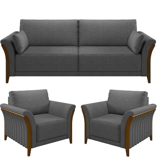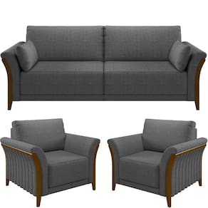 Kit Sofá 02 Lugares Sala Estar 162cm Com 02 Poltronas Stefan Pés Madeira M03 Linho Chumbo - Lyam Decor O Kit de sofá com poltrona Stefan promete marcar com elegancia e versatilidade á presença em diversos estilos de decoracao. O modelo certo é essencial para o bom funcionamento dos cômodos da casa, por isso, um sofá bem estruturado é mais do que necessário na sala de estar! O design aconchegante se destaca junto aos pés madeirados e o revestimento em linho! Extremamente elegante, que transmite a nobreza que ele precisa! Tudo isso para gerar conforto para você e sua família em uma peça única feita com todo cuidado e observada nos detalhes para superar as suas expectativas! Adquira o seu! Dimensões do Sofá (L x A x P) 162 x 88 x 88 cm Dimensões da Poltrona (L x A x P) 102 x 88 x 88 cm Características: Estrutura em madeira de reflorestamento, imunizada contra mofo. Revestimento em linho na cor Chumbo. Sustentação do assento com cintas elásticas de alta resistência. Encosto fixo almofada com fibras e flocos, revestido com kami e manta acrílica, assento com espuma D-26. Suporta até 120 kg por assento. Pés e braços em Madeira Tingidos. - Por se tratar de estofado as medidas podem ter uma pequena variação de até 3 cm. - A tonalidade do produto real poderá ter ligeira variação devido o lote de tecidos. Produto entregue montado. Indicado para residencial, sua limpeza deve ser feita com pano umedecido em água limpa, sem esfregar, não utilizar produtos abrasivos, desengordurantes, álcool ou solvente. Nunca sentar nos braços ou encosto do produto. Manter em lugar livre de umidade e/ou exposição direta ao sol. Observações importantes: - Produto para residencial em ambiente interno, não devendo ficar exposto diretamente ao sol, calor e umidade excessivos. - Pode haver alguma diferença de tonalidade entre a imagem e o produto real, por conta do tratamento de imagens e a calibração de cores do seu monitor. - As imagens são meramente ilustrativas, não acompanham objetos de decoração e eletrônicos. - Ao receber a mercadoria, o cliente deve verificar as condições da embalagem, caso haja alguma não assine o comprovante de recebimento. - Montagem, desmontagem e outras instalações serão de responsabilidade do cliente. Não nos responsabilizamos, no ato da , por subir escadas/elevadores ou pelo transporte por guincho em apartamentos. Eventuais despesas são de responsabilidade do comprador. - Confira as dimensões do produto e certifique-se de que passará normalmente por supostos elevadores, portas, escadas e/ou corredores de sua residência. NA