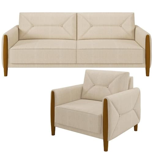 O Kit de sofá com poltrona Berilo promete marcar com elegancia e versatilidade á presença em diversos estilos de decoracao. O modelo certo é essencial para o bom funcionamento dos cômodos da casa, por isso, um sofá bem estruturado é mais do que necessário na sala de estar! O design aconchegante se destaca junto aos pés madeirados e o revestimento em linho! Extremamente elegante, que transmite a nobreza que ele precisa! Tudo isso para gerar conforto para você e sua família em uma peça única feita com todo cuidado e observada nos detalhes para superar as suas expectativas! Adquira o seu! Dimensões do Sofá (L x A x P) 220 x 90 x 90 cm Dimensões da Poltrona (L x A x P) 95 x 90 x 90 cm Características: Estrutura em madeira de reflorestamento, imunizada contra mofo. Revestimento em linho na cor bege. Sustentação do assento com cintas elásticas de alta resistência. Encosto fixo com fibras, flocos, revestida com kami e manta acrílica, assento com espuma D-26. Suporta até 120 kg por assento. Tela de ráfia. Pés em Madeira Tingidos. - Por se tratar de estofado as medidas podem ter uma pequena variação de até 3 cm. - A tonalidade do produto real poderá ter ligeira variação devido o lote de tecidos. Produto entregue montado. Indicado para residencial, sua limpeza deve ser feita com pano umedecido em água limpa, sem esfregar, não utilizar produtos abrasivos, desengordurantes, álcool ou solvente. Nunca sentar nos braços ou encosto do produto. Manter em lugar livre de umidade e/ou exposição direta ao sol. Observações importantes: - Produto para residencial em ambiente interno, não devendo ficar exposto diretamente ao sol, calor e umidade excessivos. - Pode haver alguma diferença de tonalidade entre a imagem e o produto real, por conta do tratamento de imagens e a calibração de cores do seu monitor. - As imagens são meramente ilustrativas, não acompanham objetos de decoração e eletrônicos. - Ao receber a mercadoria, o cliente deve verificar as condições da embalagem, caso haja alguma não assine o comprovante de recebimento. - Montagem, desmontagem e outras instalações serão de responsabilidade do cliente. Não nos responsabilizamos, no ato da , por subir escadas/elevadores ou pelo transporte por guincho em apartamentos. Eventuais despesas são de responsabilidade do comprador. - Confira as dimensões do produto e certifique-se de que passará normalmente por supostos elevadores, portas, escadas e/ou corredores de sua residência. NA
