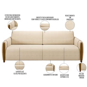 Kit Sofá 03 Lugares Sala Estar 223cm Com Poltrona Flora Pés De Madeira M03 Linho Bege - Lyam Decor - Kit Sofá e Poltrona
