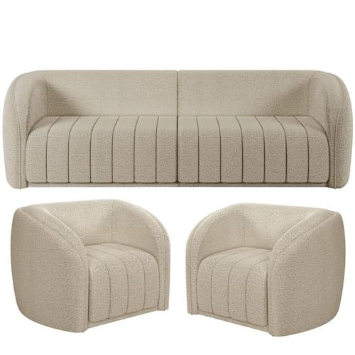 Model: Lazio | ProductContents: 01 Sofá 02 Poltronas | ColorFamily: Bege | ColorSupplier: Bege | SupplierSimpleName: Kit Sofá 05 Lugares Para Sala de Estar 332 cm Com 02 Poltronas Lazio M03 Bouclê Bege - Lyam Decor | ProductHeight: 77 cm | ColorSimple: Bege | OriginCountry: | MaterialFamily: Madeira | ProductLength: 86 cm | OriginState: PR | Material: Madeira, espuma | Color: Bege | ProductWidth: 332 cm | ProductWeight: 86 kg | ProductWarranty: 90 dias após o do produto | ProductInstructions: Produto para uso em ambiente interno, nao devendo ficar exposto ao sol, calor e umidade excessivos. | SizeDescription: Poltrona: Altura 77 cm x Largura 112 cm x Profundidade 86 cm Sofá: Altura 77 cm x Largura 332 cm x P