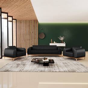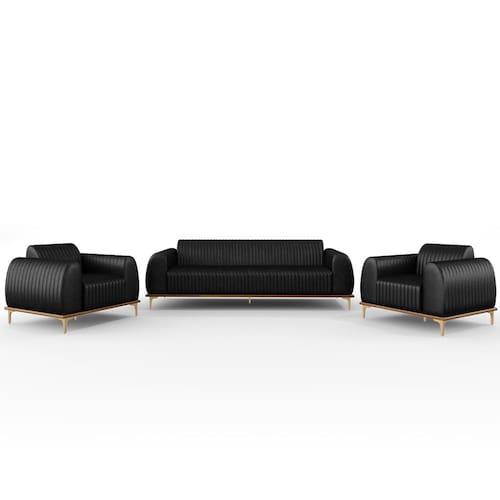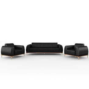 Com bastante personalidade e beleza ímpar o Kit Sofá 3 Lugares 180cm Com 2 Poltronas Molino Pés D'ouro D02 Couríssimo Preto B-159 - Lyam Decor vem para requintar ainda mais sua decoração. Amplamente sofisticado, é ideal se você está buscando por peças elegantes e confortáveis. Possui acabamentos impecáveis, é estruturado em madeira de eucalipto tratado, unidas com grampos galvanizados, base envernizada e pés de alumínio com metalização na cor D’Ouro que o tornam ainda mais atraente e convidativo.