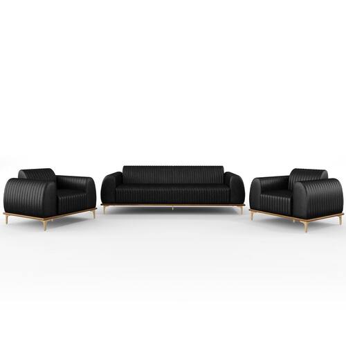 Madeira de eucalipto tratado | Couríssimo | AlumínioCom bastante personalidade e beleza ímpar o Kit Sofá 3 Lugares 210cm Com 2 Poltronas Molino Pés D'ouro D02 Couríssimo Preto B-159 - Lyam Decor vem para requintar ainda mais sua decoração. Amplamente sofisticado, é ideal se você está buscando por peças elegantes e confortáveis. Possui acabamentos impecáveis, é estruturado em madeira de eucalipto tratado, unidas com grampos galvanizados, base envernizada e pés de alumínio com metalização na cor D’Ouro que o tornam ainda mais atraente e convidativo.