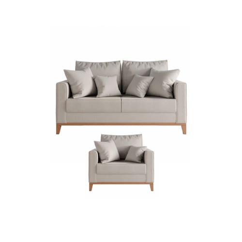 Kit Sofá e Poltrona Decorativo Beni 1,80cm Beni Base Madeira Linho Bege - Montanaris Decor