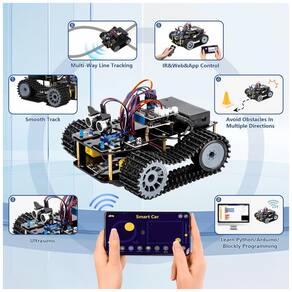 O ACEBOTT Smart Tank Robot Car Kit é um kit educativo de robótica baseado em controlador ESP32, que combina chassi tipo tanque com esteiras, rodas mecanum omnidirecionais, servos com engrenagens metálicas e sensores ultrassônicos e infravermelhos para formar um robô móvel totalmente programável. O sistema é compatível com Arduino, permite programação gráfica e inclui funções como cruzeiro com múltiplas rotas, desvio multidirecional de obstáculos e modo de seguir o usuário, com controle por aplicativo e controle remoto infravermelho para exploração prática de conceitos de navegação autônoma. O chassi em acrílico é projetado para alta resistência mecânica e o conjunto de esteiras largas garante melhor aderência e estabilidade em terrenos como grama, areia e superfícies irregulares, reduzindo ruído de locomoção.
