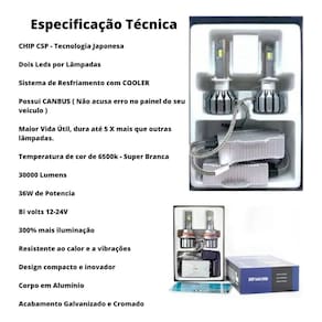 O KIT DE LAMPADA LED IRON IR100 conta com CHIP CSP de alta tecnologia (Tecnologia Japonesa), 6500K-lampadas Super Brancas, 36W de potencia, ótimo sistema de resfriamento com COOLER, e ainda, Super CANBUS, que inibe acusação de erro no painel do seu veiculo, além disso dura até 5 vezes mais que as outras lâmpadas