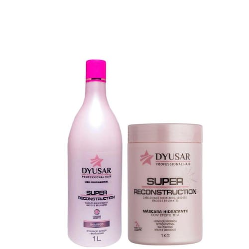 O kit contém:01 Shampoo Hidratante Dyusar Super Reconstruction 1 Litro01 Máscara Hidratante Dyusar Super Reconstruction 1kgO kit de Hidratação Express Dyusar Super Reconstruction limpa suavemente, trata, hidrata e revitaliza intensamente os fios, conferindo nutrição, força, maciez e sedosidade. Indicado para cabelos danificados, frágeis e quimicamente tratados.Sua fórmula age profundamente na fibra reparando e repondo os nutrientes perdidos, devolvendo a força, a resistência e a flexibilidade dos fios ao mesmo tempo em que hidrata, nutre e sela as cutículas para cabelos mais sedosos, com brilho e movimento natural.A Máscara Hidratante Dyusar Super Reconstruction possui efeito teia.Ingredientes:Vitaoil Plus, Lunamatrix e Silsoft AX: rico em proteínas, aminoácidos e minerais, reconstrói e restaura a fibra danificada, doando força, resistência e textura enquanto hidrata e nutre os fios, promovendo sedosidade, maciez e brilho.Modo de usar:Aplique o Shampoo Hidratante Dyusar Super Reconstruction sobre os cabelos molhados, massageando suavemente até formar espuma. Em seguida enxágue. Se necessário repita a operação.Com os cabelos úmidos aplique a Máscara Hidratante Dyusar Super Reconstruction, por toda extensão do fio, massageando suavemente. Deixe agir por aproximadamente 7 minutos. Em seguida enxágue abundantemente.Para maiores resultados, utilizar demais produtos da linha Dyusar Super Reconstruction.