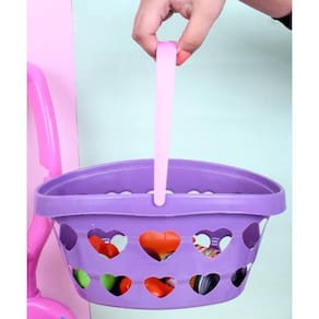 O kit vem com carrinho com cestinha e comidinhas diversas e caixa registradora com dinheiro de brinquedo
