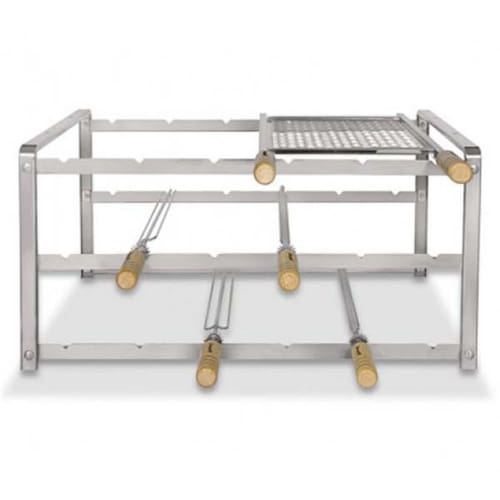 Churrasqueira Kit Suporte 1006 Inox 0404022 - Giragrill Churrasqueira Kit Suporte 1006 Inox 0404022 ? GIRAGRILL Hummm. . . Quem resiste a um churrasco delicioso em família ou com os amigos?A Churrasqueira Kit Suporte 1006 Inox 0404022 possui dois espetos tridente, dois espetos espada e uma grelha moeda em aço inoxidável com cabos de madeira marfim maior conforto térmico e durabilidade . O segundo apoio de espetos frontal é móvel para facilitar o uso, e o acesso à Grelha deixa o manuseio mais confortável. Todos os apoios frontais possuem sistema multiponto com 17 posições diferentes para girar Espetoes e Grelhas GIRAGRILL. A armação do Kit em forma de pórtico, evita sua exposição direta sobre o calor da brasa. Eleve a sua churrasqueira a um outro nível! Dados Técnicos ? O segundo apoio de espetos frontal é MÓVEL para facilitar o uso. O acesso à Grelha deixa o manuseio mais confortável. ? Todos os apoios frontais possuem sistema MULTIPONTO com 17 posições diferentes para girar Espetoes e Grelhas GIRAGRILL. Facilita muito o controle do grelhado que fica mais uniforme. ? Armação do Kit em forma de PÓRTICO para evitar sua exposição direta sobre o calor da brasa. ? Espetos e Grelhas inoxidáveis com cabos em MADEIRA MARFIM. Especificações Número de Espetos: 04 reguláveis Acionamento: Manual multiponto Acessórios: 2 Espetos Tridente, 2 Espetos Espada e 1 Grelha Moeda Capacidade: Para 18/30 pessoas material: Inox caracteristicas gerais: Número de Espetos: 04 reguláveis Acionamento: Manual multiponto caracteristicas gerais : Dados Técnicos: ? O segundo apoio de espetos frontal é MÓVEL para facilitar o uso. O acesso à Grelha deixa o manuseio mais confortável.? Todos os apoios frontais possuem sistema MULTIPONTO com 17 posições diferentes para girar Espetoes e Grelhas GIRAGRILL. Facilita muito o controle do grelhado que fica mais uniforme.? Armação do Kit em forma de PÓRTICO para evitar sua exposição direta sobre o calor da brasa.? Espetos e Grelhas inoxidáveis com cabos em MADEIRA MARFIM.