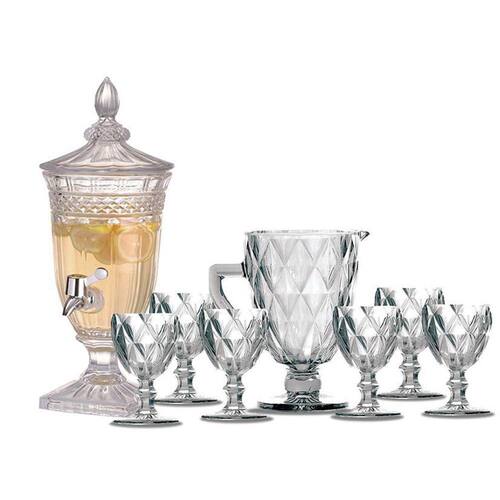 Kit Suqueira 1,8L + Taças Água + Jarra Diamante total 8pçsSuas bebidas preferidas terão um lugar super especial e ainda proporcionar muita elegância e sofisticação para sua cozinha, sala de jantar ou estar.Produzido em vidro com banho de cristal, esse dispenser possui um brilho incrível, sua superfície possui detalhes em auto relevo que remetem a estrelas, o conjunto de taças e jarra contam com detalhes delicados em formato de diamante feitas inteiramente em vidro de alta qualidadeCaracterísticas:SuqueiraAltura: 42 cm- Diâmetro: 19 cm- Material: Vidro banhado em cristal- Capacidade: 1,8 litros Taça- Altura: 17cm- Largura: 8,5cm- Diâmetro: 8,5cm- Capacidade: 300ml- Material: VidroJarra- Altura: 20 cm- Diâmetro: 13 cm- Capacidade: 1 litro- Material: Vidro- Marca: Class Home- Cor: IncolorTotal de peças: 1 Suqueira + 1 Jarra + 6 Taças = 8 Peças Cuidados: Para limpeza utilizar detergente neutro e uma esponja macia;Para deixar o vidro sempre brilhante passe um pouco de vinagre com um pano limpo na peça.Medidas aproximadas. Imagens meramente ilustrativas.Somos a CASAMIGA, uma loja especializada em utilidades doméstica e decoração. Aqui você encontra as tendências em primeira mão