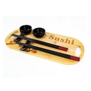 Kit sushi 7 peças. Contem 2 pratos 6,5cm x 2cm . Contem 2 pares de hashis 24cm . Contem 2 suportes de hashis 6cm x 1,5cm . Contem 1 tabua 30cm x 15cm . Composição: Bambu e Porcelana. Ideal para 2 pessoas.