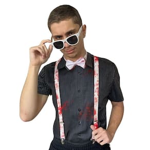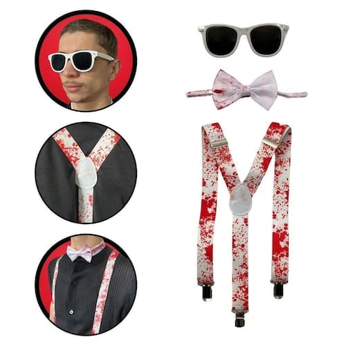 Design único de suspensório sangrento e óculos escuro para um look autêntico.