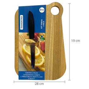 Ficha Técnica: - Material da faca: Madeira Tauari e lâmina em aço inox - Comprimento da lâmina: 5 polegadas - Material da tábua: Madeira Tauari - Dimensões da tábua: 28 x 19 cm - Acabamento: Lixado - Uso recomendado: Corte de legumes e alimentos variados