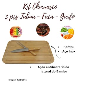 kit para churrasco com tabua de madeira, faca e garfo em cabo de madeira com laminas de aço inox. O kit de churrasco com 03 peças é perfeito, ele contém: