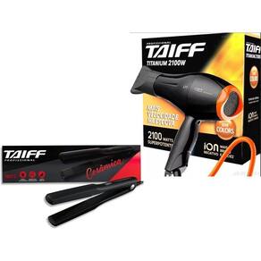 SECADOR DE CABELO PROFISSIONAL TAIFF TITANIUM COLORS ION LARANJA 2100W O Secador de Cabelo Taiff Titanuim Série Color é mais potente e modern. Design diferenciado, silencioso e com maior durabilidade, possui 2100W de potência, 2 velocidades, 5 temperaturas, botão jato de ar frio e fio de 3 metros.Para deixar seus cabelos mais brilhantes e macios, ele promove a emissão de 67 milhões de íons negativos por cm3. Os íons neutralizam a eletricidade estática e selam as cutículas dos fios. Os íons negativos também reduzem o tempo de secagem, pois diminuem de 4 a 6 vezes uma gota de água, facilitando sua penetração nos fios e deixando os cabelos hidratados e sedosos. CaracterísticasNanotecnologia titânio Silencioso Longa durabilidade Redução no tempo de secagem Cabelos hidratados e sedosos Com bico de ar em PPS que supera altas temperaturas, direciona o fluxo de ar e facilita a modelagem. Jato de ar frio simDifusor nãoDobrável nãoNº de velocidades 2Temperaturas 5Portátil nãoTecnologia ÍonsEspecificações TécnicasPotência (W) 2100Comprimento do fio 3 metrosMotor AC - sim DimensõesAltura 22cm Largura 21,5cm Profundidade 10cm Peso 788 Gramas Garantia 6 meses 1 Manual e certificado de garantiaCHAPINHA PRANCHA ALISADORA TAIFF CERAMICA 180ºC - BIVOLTCompacta E Moderna, A Chapinha De Cabelo Taiff Cerâmica Com 180 Graus, Led Indicador E Cabo De 1.80m - Bivolt Automático Oferece Resultados Rápidos E Eficientes Sempre Que Você Precisar. Este Equipamento Funciona Através De Um Aquecimento Cerâmico Que Protege Os Fios E Uma Tecnologia Que Não Permite Oscilação Na Temperatura (Ptc). O Deslizamento Ocorre Facilmente E Seus Cabelos Estarão Muito Mais Seguros.