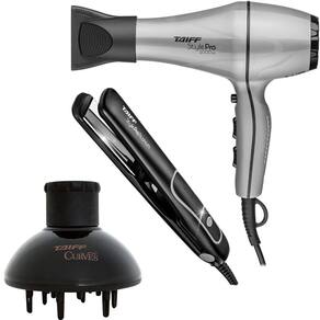SECADOR DE CABELO PROFISSIONAL TAIFF STYLE PRO 2000W PRATA - 220VIdeal para uso profissionalCabo de 3 metrosPotência de 2000WVoltagem -220vCaracterística/AçãoMotor AC ProfissionalCHAPINHA PRANCHA ALISADORA TAIFF STYLE PRATA PRO TITANIUM 230ºC - BIVOLT-Temperatura de 230°c – Ideal para processos químicos;- Perfil de Titanium: Melhor desempenho para progressivas;- Aquecimento instantâneo;- Amortecimento em silicone;- Aquecimento PTC;- Botão liga e desliga indicado em Led;- Cabo de 3 metros de comprimento ;- Leve e ergonômica;- Bivolt automático.DIFUSOR DE AR CURVES TAIFFDimensões do produto com embalagem (compr. x alt.): 153 x 146 mm
