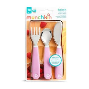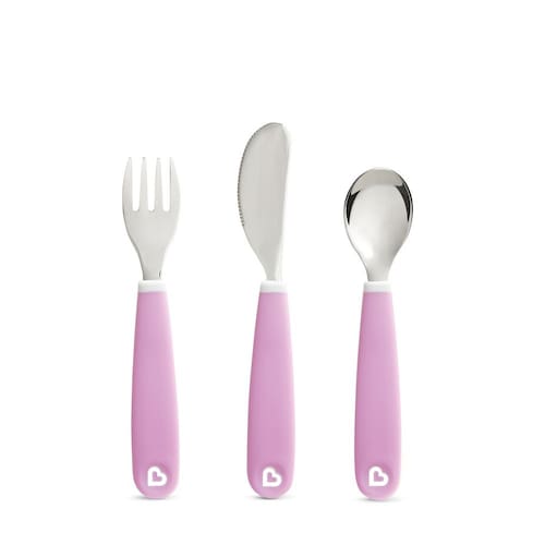 Conjunto de talheres roxos infantis da marca Munchkin, de alta qualidade e prático. Ideal para crianças.
