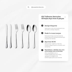 Kit Talheres Hercules Olimpia Aço inox 6 peças Descrição: O Kit de Talheres com Colher, Faca e Garfo da nossa linha premium é perfeito para quem busca unir funcionalidade e estilo. Produzido em aço inox de alta qualidade, cada peça foi cuidadosamente elaborada para proporcionar máxima durabilidade e resistência. Com um acabamento impecável e design moderno, os talheres oferecem conforto e ergonomia, tornando cada refeição um momento ainda mais especial. A faca possui lâmina afiada, ideal para cortes precisos, enquanto o garfo e a colher apresentam detalhes suaves e polimento brilhante que trazem um toque de requinte para qualquer mesa. Seja para um jantar casual ou uma ocasião especial, esse conjunto é a escolha perfeita para quem valoriza sofisticação. Venha transformar suas refeições com este kit exclusivo que combina tradição e inovação em cada detalhe. Características: - Aço inoxidável; - Aço Inox 18/10; - Acabamento Premium com alto Brilho; - Ergonômico; - Lamina Forjada e Temperada; - Polimento entre os dentes; - Ponta Arredondada; - Monobloco, obtidas de uma única peça, sem emendas; - Design Exclusivo e Sofisticado; - Pode ir a Lava Louças; Composição do Kit: - 2 Facas de Mesa: 22,6 cm; tamanho lâmina 12cm e espessura 3 mm - 2 Garfos de Mesa: 20,3 cm e espessura 2,5 mm - 2 Colheres de Mesa: 20,3 cm e espessura 2,5 mm Especificações: Marca: Hércules; : 3 meses; ---- Aqui na Casa & Tendência você encontra os melhores utensílios domésticos e tudo que você precisa para sua cozinha ---- Marca: Não Informado