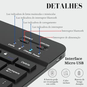 Especificações: - Altura: 15cm - Largura: 24,5 cm - Conector teclado: Micro USB - Conector mouse: 2 pilhas AAA não inclusas - Configuração: ABNT 1 - Distância de trabalho: 10m - Conexão: Via Bluetooth - Economia de bateria: Após 10 minutos de inatividade - Peso: 190g