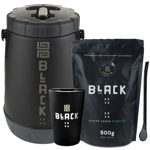 Kit Tereré Erva Burrito + Copo E Bomba Preta + Garrafa Térmica Black Erva Erva Mate Tereré Black Erva 500g Sabor Burrito O Tereré possui efeito diurético, que colabora no processo de redução da gordura corporal. A bebida estimula o aumento o gasto energético dos consumidores, por proporcionar maior força muscular e, consequentemente, melhor desempenho nos treinos. Erva mate especial, com aroma inconfundível e sabor agradável Elaborada para quem aprecia uma erva mate de qualidade superior e sabor exótico. Pacote com 500g com sistema zip lock para maior conservação do produto. Modo de Preparo: - Coloque 3/4 de Black Erva na guampa, cuia ou copo. - Incline e acomode a Black Erva sobre um lado da guampa, cuia ou copo. Deixe a bomba no local adequado. - Tome com água gelada a gosto e saboreie sua Black Erva. Consumir com água gelada para melhor aproveito do sabor. ESPECIFICAÇÕES TÉCNICAS: - Marca: Black Erva - Ilexx paraguariensis Erva Mate - Padronização Erva Mate Folha 100% - Não contém glúten Copo Cuia Para Terere Black Erva Preto Fosco 350ml Para você que quer apreciar uma deliciosa erva mate, sozinho ou com seus amigos, com essa cuia você vai fazer isso no maior estilo A cuia possui a aparência Preta com a estampa da marca Black Erva. Possui a superfície lisa e fácil de limpar. ESPECIFICAÇÕES TÉCNICAS: - Produto com ótimo acabamento - Resistente e com alta durabilidade - Material: Acrílico - Capacidade: 350ml - Altura: 11,5cm - Diâmetro Boca: 8cm - Peso: 60g Bomba Para Tereré E Chimarrão Tradicional Black Erva Preto A Black Erva é o novo conceito para terere no Brasil, com produtos de alta qualidade Essa bomba tradicional e prática possui grande durabilidade e é extremamente bonita. Pode ser Utilizado para o consumo de Erva Mate aonde você estiver: seja entre amigos, no trabalho ou em casa. ESPECIFICAÇÕES TÉCNICAS: - Material de alta qualidade e pintura epóxi um revestimento de alta resistência - É de fácil utilização e limpeza, não acumula cheiro ou resíduos - Anti entupimento - Medidas: 19 x 2 cm - Cor: Preto Garrafa Térmica Black Erva 2.5lt Tereré Preto Para Água E Suco A Black Erva é o novo conceito para terere no Brasil, com produtos de alta qualidade Essa garrafa foi feita especialmente para você que deseja utilizá-la no dia a dia. Seja para levar na piscina, na viagem, camping, pescaria e praia, e ter bebida quente ou gelada a sua disposição por onde quiser Possui parede de isolamento térmico, conservando a temperatura de suas bebidas por mais tempo. É capaz de manter o gelo por até 12 horas, e bebidas quentes e frias por 8horas. Um produto de excelente qualidade e alta durabilidade, de design moderno e belo. Possui um bico dosador como sistema de despejamento do líquido que facilita a forma de servir a bebida e garante que a garrafa esteja sempre fechada, evitando vazamentos e a entrada de poeira e insetos. Além disso, possui uma borracha como método de vedação na parte interior da grande tampa, e um sistema de rosca firme para a abertura e fechamento da garrafa. Vem com2 alças, que facilitam o transporte e o momento de se servir. ESPECIFICAÇÕES TÉCNICAS: - Marca: Black Erva - Capacidade: 2,5L - Isolamento térmico feito em Poliuretano PU - Dimensões: Altura 26cm x Largura 16,5cm - Peso: 500g ITENS INCLUSOS: - 1x Erva Mate Tereré Black Erva 500g Sabor Burrito - 1x Copo Cuia Para Terere Black Erva Preto Fosco 350ml - 1x Bomba Para Tereré E Chimarrão Tradicional Black Erva Preto - 1x Garrafa Térmica Black Erva 2.5lt Tereré Preto Para Água E Suco