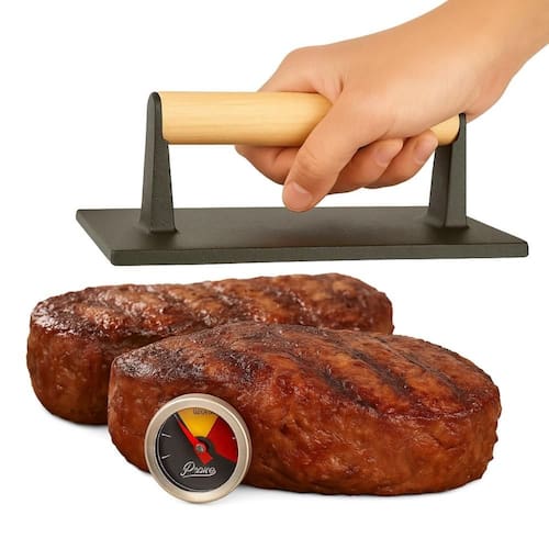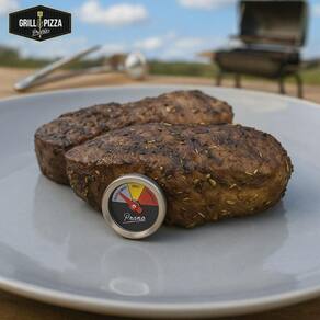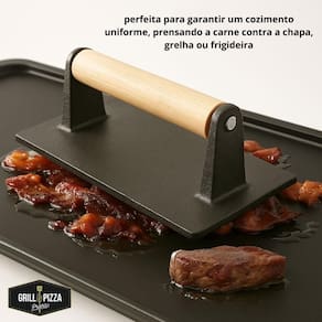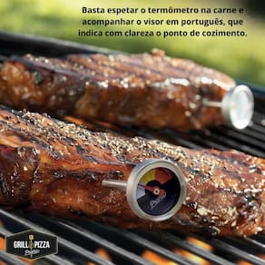 O Kit para grelhados e assados da marca Grill & Pizza inclui um Termômetro Culinário e uma Prensa para Carnes, garantindo praticidade e qualidade no preparo de suas carnes.