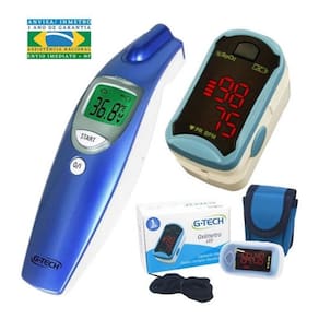 O Oxímetro G-TECH é de alta precisão e pode ser utilizado tanto por profissionaisde saúde como por pacientes no ambiente doméstico para monitorização daporcentagem de saturação de oxigênio no sangue (SpO2) e dos batimentoscardíacos por minuto.Além de altamente preciso nas leituras, o Oxímetro G-TECH possui o melhor tempode resposta quando comparado a outros similares no mercado. Em momentos devariações abruptas de batimento cardíaco ou SpO2, muitos oxímetros “congelam”por vários segundos, podendo levar à leituras incorretas. O avançado algoritmo doOxímetro G-Tech consegue detectar e apresentar instantaneamente o resultado realda medição mesmo durante essas variações abruptas.Características: - Visor em tecnologia LED de alto contraste, facilitando a visualização dos resultados- Informa Saturação (SpO2) e Frequência Cardíaca- Gráfico em Barras- Capa protetora em Silicone e Estojo para armazenamento- 1 Ano de Garantia Itens Incluso:- 01 Oxímetro de pulso G-tech Led- 01 Estojo para Transporte- 01 Capa de proteção de silicone- 01 Cordão de transporte- 02 Pilhas AAA- 01 Manual de Instruções**Produto com selo do Inmetro*Certificado Pela Anvisa 80275310062O termômetro digital da G-Tech infravermelho é ideal para medir a temperatura corpórea, do ambiente e superfícies. Com infravermelho, a medição é instantânea sem contato com a pele. Conta com o visor Color Glow: o display muda de cor conforme a temperatura indicada, facilitando a leitura; possui a inovadora tecnologia Touch Free, onde basta aproximar o sensor da testa a uma distância de 5 a 10 centímetros para obter a temperatura corpórea em poucos segundos. Não há necessidade de contato do aparelho com a pele, o que torna a medida muito mais conveniente, higiênica e rápida, com toda a segurança de um produto clinicamente validado!Indicado para medição de temperatura corpórea a distância (sem contato) de maneira rápida e precisa, mas também pode ser utilizado para medir a temperatura de superfícies de objetos, como por exemplo: - Temperatura do leite na mamadeira do bebê;- Temperatura do banho do bebê;- Temperatura ambiente.- Possui alarme de febre e memória para 30 medições. BENEFÍCIOS:- Touch Free - Sem contato- Mais prático e higiênico- 3 em 1: Medição da Temperatura Corpórea, Ambientes e Superfícies- Infravermelho: Medição instantânea- Alarme de Febre- Tempo: aproximadamente 1 segundo- 30 memórias- Visor Color Glow: display do termômetro muda de cor conforme a temperatura indicada, facilitando a leitura:Abaixo de 37,5oC – VerdeAcima de 37,5oC – Vermelho- Memória: ao ser ligado o Termômetro exibe no visor o valor da última medição automaticamente durante 2 segundos ou a visualização das 30 últimas leituras utilizando o Modo Memória, sendo possível o monitoramento eficaz das variações de temperatura.**Produto com registro no INMETRO ITENS INCLUSOS:- 01 Termômetro Digital de Testa Sem Contato G-Tech- 01 Suporte para o Termômetro- 01 Capa para armazenamento- 02 Pilhas AAA inclusas- 01 Manual de Instruções em português GARANTIA:01 Ano
