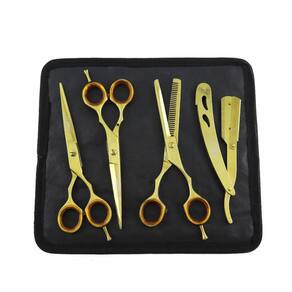 kit com 3 tesouras e 1 navalhete profissional tamanho 6. 0 polegadas, em aço 420c. Fabricadas no paquistão. Somos os proprios fabricantes e importadores direto do paquistan. Kit perfeito para quem deseja trabalhar com produto 100% novo e de alta qualidade ferramentas ideias para cabeleireiros e barbeiros. Tesouras com acabamento mais leves e resistentes. Suas composições preservam o funcionamento e afiação das tesouras por mais tempo. As navalhas são indicadas para barbear, dar acabamento ou finalizar cortes. Kits compostos por: 1 tesoura fio laser 6 polegadas 1 tesoura fio navalha 6 polegadas 1 tesoura desfiadeira 6,0 1 navalha