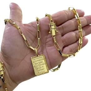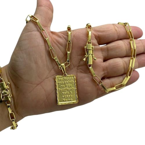 Kit Tijolinho 6mm + Pai Nosso Banhado a Ouro Detalhes do Produto: Material: ligas metálicas de alta qualidade, especialmente tratadas para fixação e absorção do ouro, com acabamento em verniz protetor. Aparência: visual idêntico ao ouro maciço. Produção: artesanal, com atenção meticulosa aos detalhes. Banho: 10 camadas espessas de ouro 18k, finalizadas com verniz antialérgico . Elos: soldados varia conforme o modelo . Pedras: zircônias brilhantes cravejadas quando aplicável . Tamanhos Disponíveis: Cordões Masculinos: 70cm padrão e 60cm sob consulta/Pedido Via Chat . Cordões Femininos: 50cm padrão e 45cm sob consulta/Pedido Via Chat . Pulseiras: 21cm padrão ; tamanhos de 18cm a 23cm sob consulta/Pedido Via Chat. Pingentes: conforme imagens; consulte para mais detalhes via chat. Espessuras Recomendadas para Cordões / Pingentes: P: 1mm a 4mm M: 4mm a 8mm G: 6mm a 13mm Gg: 12mm a 18mm Incluso na Compra: Saquinho de organza para armazenamento seguro. Caixa elegante, perfeita para presente. Cupom de desconto para a próxima compra. Flyer com outros produtos da coleção. Carta de agradecimento personalizada. Adesivo da marca ToJoia18k. Informações Adicionais: : 6 meses termos acompanham o produto . Devolução: 7 dias para devolução sem questionamentos. Envio: despacho em até 24 horas úteis após confirmação do pagamento. Cuidados com a Peça: Evite contato com produtos químicos; aguarde o perfume secar antes de usar. Evite contato com shampoo, condicionadores e suor excessivo. Armazene em local seco, preferencialmente no saquinho de organza fornecido. Uso no mar e piscina é permitido; lave com água corrente e sabão neutro após. Por que Escolher a ToJoia18k Semi-joias luxuosas que combinam estilo, qualidade e sofisticação. Banho espesso de ouro 18k, garantindo brilho duradouro e acabamento impecável. Design exclusivo e produção artesanal, perfeitos para qualquer ocasião. Materiais premium que asseguram durabilidade. Ao escolher uma semi-joia ToJoia18k, você investe em qualidade, elegância e uma experiência única. Aguardamos sua compra Observação: pode ocorrer variação no fecho raramente . Imagens reais, sem edição. Qualquer dúvida, estamos à disposição para esclarecimentos.