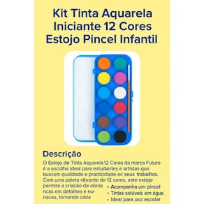 Deixe a criatividade fluir com o Estojo de Tinta Aquarela 12 Cores da Futuro Escolar! Ideal para crianças, estudantes e iniciantes, este kit combina praticidade, qualidade e diversão para momentos artísticos inesquecíveis.