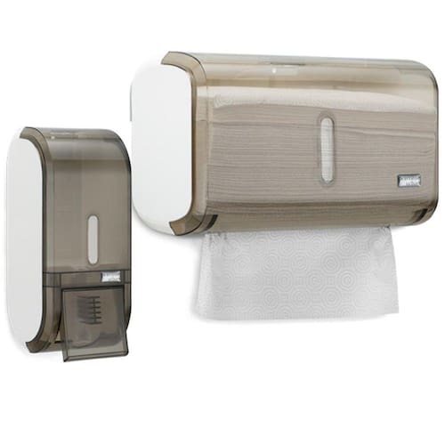 Kit toalheiro compacto premisse 2d fume + saboneteira compacta com reservatório 400ml Combo com 1 toalheiro compacto premisse urban 2d fume + 1 saboneteira compacta premisse linha urban com reservatório 400ml fume
