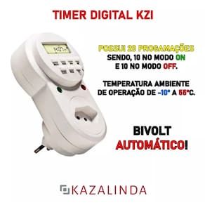 Timer Digital E Temporizador Tomada Energia Bivolt 2000w Kzi Timer Digital com Contagem de Segundos Kazalinda. Temporizador Digital: é um comando individual capaz de controlar ações de ligar e desligar cargas diversas com programações que vão desde semanais até segundos. Possui até 9 programações de controle automático, além de possibilitar o acionamento ou desligamento da carga manualmente. Contém Função de Contagem Regressiva, onde é programado um tempo para desligar a carga, possui uma bateria de backup embutida para salvar as predefinições e programas do usuário. Características Técnicas Tensão: 127 / 220 vca – Bivolt Automático Frequência: 50 / 60 Hz Consumo Standby: 1,6 w Plugue e tomada elétrica padrão NBR14136 Garantia: 3 meses Programação: horas, minutos, segundos, diária e semanal Até 20 programações (10 on e 10 off) Temperatura ambiente de operação: -10º a 55ºC Bateria interna recarregável ni-mh 1,2 V 80 m a Potência de comando: Tensão Resistiva Indutiva Eletrônica 127 V 1000 W 400 va 300 w 220 V 2000 W 800 va 600 W ___________________________________________________ Aquecedor De Toalhas Térmico Grande Preto- 110 Direito TOALHEIRO TÉRMICO GRANDE PRETO - Para 02 TOALHAS O Toalheiro Térmico mantém as toalhas em uso sempre secas e aquecidas, além de desumidificar e de proporcionar uma agradável temperatura ao ambiente! É de fácil instalação, reduz a proliferação de fungos e ácaros nas toalhas, eliminando o mau cheiro. Com baixo consumo de energia e com aquecimento controlado e permanente, não resseca ou danifica a toalha. É uma peça decorativa que se adapta aos mais variados estilos de ambientes. Possui um excelente apelo Ecológico, pois reduz a quantidade de lavagens das toalhas, proporcionando maior vida útil aos tecidos, além de diminuir o consumo de água e produtos químicos liberados no meio ambiente. Material: Epoxi Preto Medidas: 770X115X550MM Garantia: 03 Anos Segurança Total paras Crianças * Favor selecionar no ato da compra a Voltagem e o Lado do Fio desejados. Obs.: O lado do fio é de acordo com o Toalheiro já fixado na parede. * Foto meramente ilustrativa, as toalhas não acompanham o produto. BENEFÍCIOS AO CONSUMIDOR * Reduz a proliferação de fungos e ácaros nas toalhas; * Evita mau cheiro nas toalhas; * Sua toalha seca em muito menos tempo; * Sensação incrível de uma toalha sempre quentinha; * Baixo consumo de energia; * Desumidifica o ambiente; * Diminui a lavagem das toalhas, proporcionando uma maior vida útil para os tecidos; * Peça decorativa; * 3 Anos de garantia; * Produto ecologicamente correto. PERGUNTAS MAIS FREQÜENTES * Oxidação e ferrugem das peças - A pintura exigida para toalheiros é Epóxi a pó, pois resiste a agressividade que encontramos no ambiente do banheiro.* Possibilidade de choque e curto elétrico - Os componentes elétricos são isolados, não havendo possibilidade de choque elétrico, levando em consideração uma instalação adequada. * Queima das toalhas - A potência de cada aparelho faz com que a temperatura seja ideal para secar toalhas, não há possibilidade de queimar os tecidos, apenas não se recomenda o uso de tecidos à base de "nylon" ou sintéticos. * Queimaduras em pessoas desavisadas – A temperatura do toalheiro não provoca queimaduras em pessoas. * Manutenção dos aparelhos – Indicamos a utilização freqüente dos produtos e sua limpeza regular apenas com pano úmido e/ou álcool.