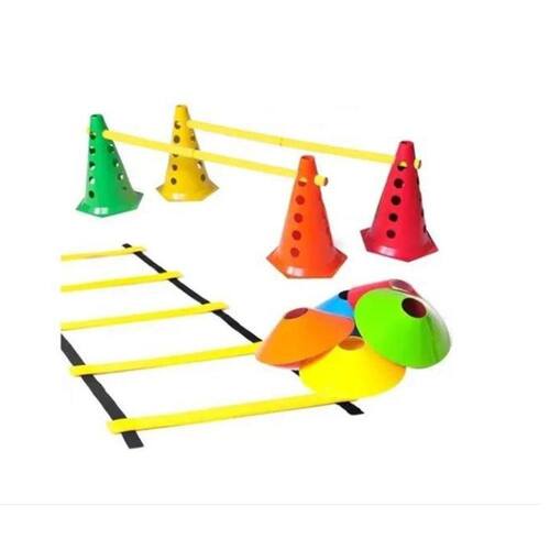 ITENS INCLUSOS: 1 escada de agilidade de 3m com os degraus em eva e fitas e nylon 10 chapéus chinês 3 barreiras de 90 cm com sinalizadores 6 cones com furo colorido com 23 cm de altura