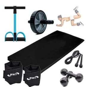 Kit Treino em Casa C / 6 Itens Caneleira de 4kg + Halter de 3kg + Colchonete + Roda ABD + Extensor + Corda A Caneleira de Peso 1 kg Academia e Ginástica é ideal para a prática de exercícios de ginástica, academia, musculação, etc com peso. São caneleiras profissionais com carga, feitas em Capota reforçado, dando mais conforto ao tornozelo. Não absorve suor, é fácil de limpar e higienizar Possui uma costura dupla de reforço, evitando o vazamento do enchimento. Seu sistema de fechamento é feito em tiras aderentes, garantindo facilidade e segurança na hora de prender a caneleira na perna. Características: Cor: Preto Lavável: Sim Sistema de Fechamento: tiras aderentes Outros: Confortável ao tornozelo, não absorve suor, fácil de higienizar, possui costura reforçada evitando o vazamento do enchimento. Membros ou Músculos Trabalhados: Coxas, abdômens, glúteos, panturrilhas e braços. Material: Nylon reforçado Quantidade: 01 - PAR Caneleira de 1 kg O Colchonete 90 x 45 x 2 cm é ideal para ter mais conforto na hora de fazer seus exercícios, praticar yoga, pilates ou qualquer exercício funcional. Ele é super prático, fácil de guardar, e é fabricado em espuma de20 mm com densidade D16, sendo confortável na medida certa. No exterior, é revestido em Napa lavável e impermeável, o que facilita quando houver necessidade de higienização e no excesso de suor na prática de exercícios. Você vai se sentir mais confortável para fazer abdominais e outras atividades físicas, além de seu uso ser indispensável para proteger a coluna e evitar lesões. AÇÕES E BENEFÍCIOS: - Confortável com enchimento em espuma 20mm de densidade D16 - Leve e prático para transporte e armazenamento - Tecido lavável e impermeável garante durabilidade do produto - Ideal para quaisquer exercícios, prática de yoga, pilates e outras atividades INDICAÇÕES: - Prevenir a coluna e o corpo de lesões em exercícios no solo - Ideal para ter mais conforto na prática de quaisquer atividades esportiva O Pula Corda Simples é ótimo para trabalhar e fortalecer músculos, glúteos e melhorar a respiração. Auxilia também na perca de peso e melhora a freqência cardiorrespiratória. Possui corda de silicone de alta resistência. - Corda de PVC - Corda para pular em silicone - Exercício aeróbico de grande . - Fortalece as coxas, panturrilha, abdômen e braços. - Melhora o ritmo a coordenação e o equilíbrio. - Medida aproximada: 2,65 m ITENS INCLUSOS 1 Colchonete 90x45x2cm 1 Caneleira 1 Kg 1 Par halter 1 kg 1 Roda Abdominal 1 Extensor com apoio de pé 1 Corda de pular em PVC