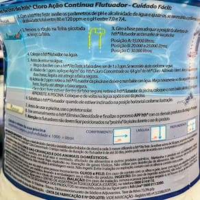 Sua fórmula com active clear tm preserva a cristalinidade da água e previne a água verde. O resultado é a certeza da suapiscina sempre pronta de um jeito muito fácil.Active clear tm é uma tecnologia exclusiva desenvolvida pela hth que inibe o crescimento de algas e aglomera os resíduos em micro partículas,eliminando-as na filtração.Instruções de uso:1. Com a hth fita teste avalie os parâmetros de alcalinidade e ph da água e ajuste-os, se necessário, conforme a recomendação:alcalinidade total entre 80 e 120ppm e o ph entre 7,0 e 7,4.2. Remova o rótulo do produto na linha picotada ao longo da faixa.3. Gire a base para adequar a posição da abertura do hth cloro flutuador ao tamanho da sua piscina:flutuador - 830 gposição a: 15.000 litrosposição b: 20.000 a 25.000 litrosposição c: 30.000 litros4. Coloque o hth cloro flutuador na água.5. Antes de entrar: meça o cloro livre com a hth fita teste. A faixa segura para uso da piscina é de 1 a 3 ppm de cloro livre. Se necessário,ajuste conforme segue:a abaixo de 1 ppm: aplique 4g/m do hth cloro concentrado tradicional ou 4,4g/m do hth cloro aditivado mineral brilliance tm 10em1.Meça novamente em duas horas. Repita até atingir a faixa segura.B acima de 3 ppm: retire o hth cloro flutuador da piscina e deixe-o num balde com água. Meça novamente no dia seguinte ou após seis horas.Repita até atingir a faixa segura.Coloque-o de volta na água após o uso da piscina.6. Substitua o hth cloro flutuador quando ele estiver inclinado na posição horizontal.7. Os flutuadores não deve ficar posicionados na prainha durante o uso do produto.Dúvidas frequentes:- pode ser em piscina de fibraR: sim, pode ser em piscina de fibra.- dentro do recipiente são pastilhas de cloroR: sim, dentro do recipiente contém pastilhas de cloro.- ele tem ação contra água verdeR: sua fórmula com active clear tm preserva a cristalinidade da água e previne a água verde.- ele tem ação antibacterianaR: sim, o cloro flutuador hth elimina 99% das bactérias.- a água tratada com este produto serve para beber e cozinharR: não, somente para o banho, não pode ser Utilizado para consumo.- esse produto dispensa o uso das pastilhas de cloroR: sim, esse produto já possui as pastilhas de cloro. Marca: Não Informado