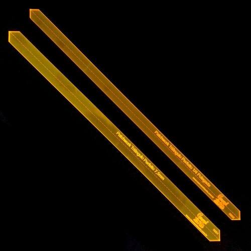 Kit Triangulo Perfeito cm e pol. Kit composto por 2 réguas sendo: 1 Régua com marcações em Polegadas Tamanho de 1/2 x 12 Polegadas Margem de 1/4" - marcação tracejada na régua 1 Régua com marcações em Centímetros Tamanho de 1,5 x 30 centímetros Margem de 7,5 mm - marcação tracejada na régua Régua criada para uso em blocos quadrados e triangulares. Trabalhos: colchas, centros de mesa, bolsas e jogos americanos e tudo mais que a sua imaginação permitir Ideal para Patchwork, Scrapbook. Marca: Carrossel da Arte Material: Acrílico Virgem Cor: Laranja fluorescente transparente Espessura: 3 mm Régua gravados a laser, que nunca vão ser apagadas.