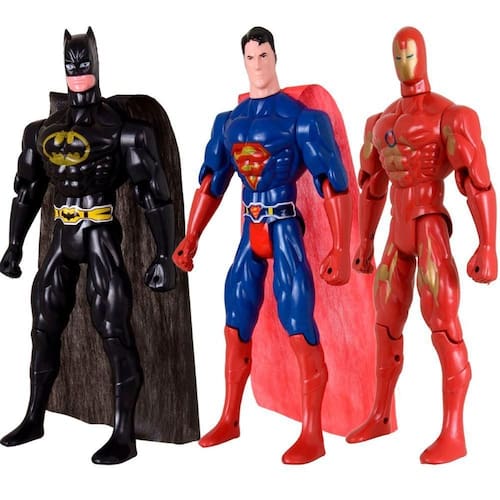 1 Boneco Articulado Homem Aranha 29cm; 1 Boneco Articulado Homem De Fero 29cm; 1 Boneco Articulado Super Man 29cm;