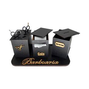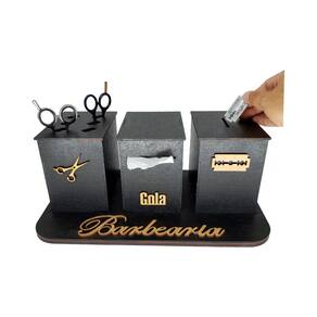 O Kit Trio Descarte de Lâminas + Suporte Gola + Tesouras, com suporte para 6 tesouras + caixa de descarte para lâminas removível + caixa suporte para gola higiênica.Produto desenvolvido em MDF de alta qualidade e cortes a laser, para garantir melhor acabamento e durabilidade.