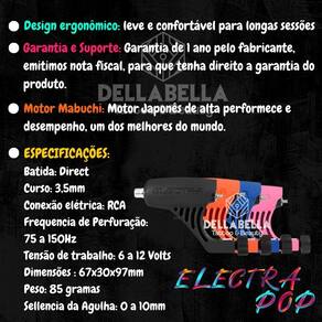 Kit Trio Electra POP com Fonte Aurora Trio Tattoo Tatuagem Cor: Azul Apresentamos o Kit Trio Electra POP, um conjunto completo de alta qualidade projetado para tatuadores profissionais que buscam aprimorar suas habilidades artísticas e proporcionar resultados excepcionais aos seus clientes. Com a poderosa Máquina Electra POP e a avançada Fonte de Alimentação Aurora, esse kit oferece a combinação perfeita de desempenho, precisão e confiabilidade para uma experiência de tatuagem única. Máquina Electra POP - Especificações: - Indicação: Recomendada tanto para tatuadores iniciantes quanto experientes, a Electra POP é versátil e ideal para realizar traços precisos e sombreamentos suaves com facilidade. - Faixa de Voltagem Recomendada: A Electra POP opera entre 4v e 12v, permitindo ajustes precisos de voltagem para se adequar a diferentes técnicas e estilos de tatuagem. - Velocidade Máxima: Com uma velocidade máxima de 10.000 RPM, a Electra POP oferece um desempenho potente, garantindo linhas nítidas e preenchimentos eficientes. - Conexão: A máquina possui conexão RCA, proporcionando uma conexão segura e estável com a fonte de alimentação. - Curso da Batida: Com um curso de 3,5mm, a Electra POP proporciona uma sensação suave e confortável durante o uso. - Material do Chassi: Construída com alumínio de aviação, a máquina é leve e durável, garantindo alta resistência e longa vida útil. Fonte Aurora - Especificações: - Display Digital: Permite ajustar a voltagem de forma precisa, variando de 4v a 18v, em incrementos de 0.1v. - Função de Memória: A Fonte Aurora possui memória interna que armazena as configurações utilizadas anteriormente. - Pedal Integrado: Possui um pedal inteligente, dispensando a necessidade de um pedal externo. - conexão: rca - Voltagem de Entrada: Bivolt 110v - 240v - Material: Liga de Alumínio - Dimensões: Aproximadamente 11,5 cm x 7,5 cm x 2,5 cm - Peso: Aproximadamente 140g