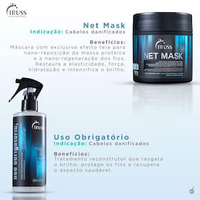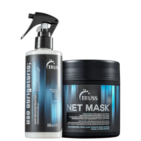Kit Truss Net Obrigatório conta com uma máscara repositora de massa com fórmula inteligente, que regenera as hastes danificadas e prolonga a hidratação dos fios para um aspecto saudável e bonito. Além disso, o tratamento reconstrutor fortalece o cabelo, protege contra desgastes e quebras futuros.