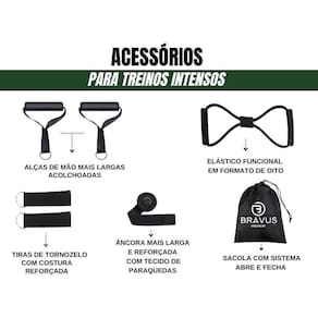 Acabamento Super Reforçado e Elásticos 100% Látex Natural Qualidade Premium O Kit Tubing Premium Extreme Bravus Sport foi feito para os usuários mais exigentes e que buscam um produto de alta resistência para superar todos os limites e levar seu treino para outro nível. Combine 5 elásticos de diferentes resistências e crie diversos níveis de carga de acordo ao seu perfil de treino O elástico tubing antipressão é feito de material de qualidade premium, 100% látex natural, o que gera uma resistência dupla. Os mosquetões de aço resistente e as tiras firmemente costuradas também evitam o rasgo, mesmo sob a extrema resistência ao estiramento.