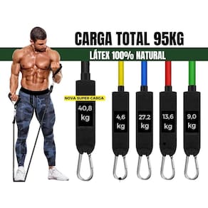 O Kit Premium Extreme vem com 5 elásticos de borracha em forma de tubo duplamente reforçados, feitos de látex 100% Natural. Cada elástico tem 1,20 m de comprimento com garras em metal de alto calibre e que permitem um treino muito mais potente.