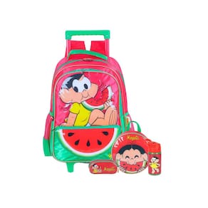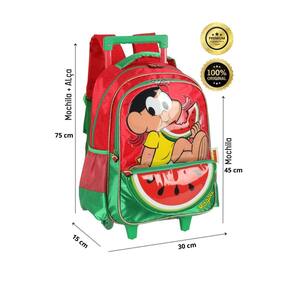 Kit escolar turma da monica mochila de rodinha + lancheira térmica + estojo triplo + garrafinha inox mochila de rodinha: Confeccionada em poliéster Fechamento em zíper Puxadores personalizados Compartimentos espaçosos 2 bolsos laterais para garrafa Possui rodas e alças de costas reguláveis e alça de mão Design exclusivo Medidas aproximadas: Altura: 45 cm Largura: 15 cm Comprimento: 30 cm