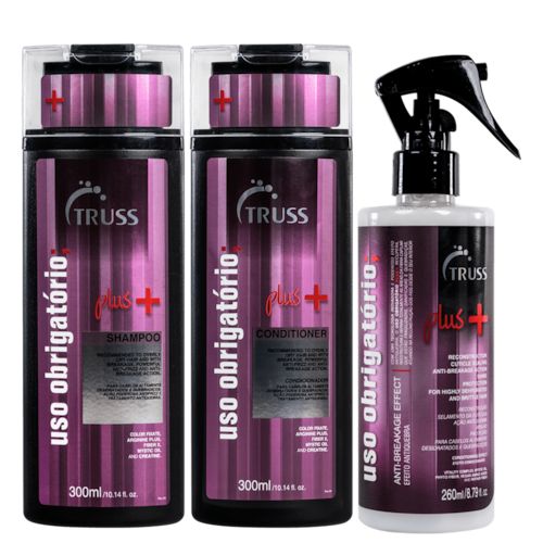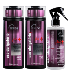 Kit com shampoo, condicionador e reconstrutor para cabelos danificados. Uso Obrigatório Plus+ possui um poderoso efeito antiquebra, atuando na reconstrução dos fios desde o seu interior, além de reparar intensamente.