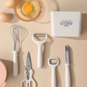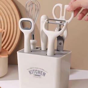 O kit inclui ferramentas indispensáveis: uma tesoura multiuso ideal para cortes precisos, um batedor de claras (fouet) reforçado, um descascador de legumes eficiente, uma faca versátil e um abridor de garrafas ergonômico. Todas as peças são acompanhadas por uma base plástica compacta, que mantém os utensílios sempre à mão e organizados, ocupando pouco espaço na bancada. Com acabamento na cor branca (off-white), o conjunto apresenta um design moderno que se adapta a diferentes estilos de decoração de cozinha.