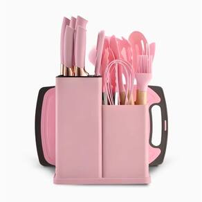 Fabricados com silicone premium e detalhes em madeira e aço inoxidável, os utensílios são resistentes ao calor, antiaderentes e fáceis de limpar, tornando cada preparo mais seguro e confortável. Além disso, o conjunto inclui facas de alto desempenho, uma tábua de corte e um porta-utensílios, proporcionando uma experiência completa para qualquer cozinha.