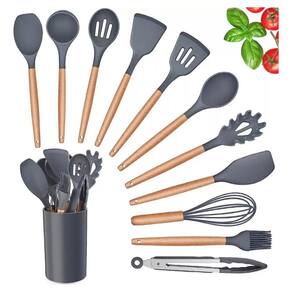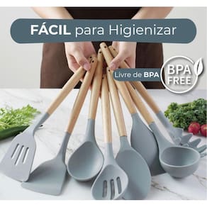 Kit Utensílios Cozinha Talher Silicone 12 Peças Cabo Madeira
