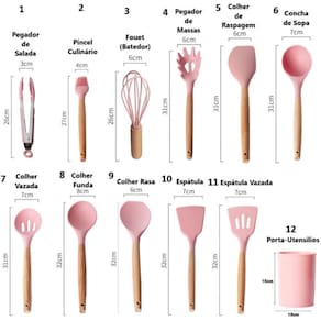 Cada utensílio é feito com silicone resistente ao calor e antiaderente, garantindo que suas panelas fiquem livres de arranhões e manchas. Os cabos de madeira não apenas adicionam um toque rústico e sofisticado, mas também são projetados para não transmitir calor, proporcionando um manuseio seguro e confortável. Simples de limpar, estes utensílios podem ser higienizados na máquina de lavar louça, economizando seu tempo e esforço. Resistência Térmica: O conjunto de utensílios suporta temperaturas de -30 a 230°C, tornando-o perfeito para uma variedade de tarefas de cozinha para o dia a dia, confeitaria entre outros preparos na cozinha. Segurança Alimentar Garantida: Jogo de utensílios em silicone e livres de BPA, assegurando a saúde de sua família.