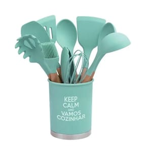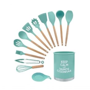 Kit com 13 Utensílios de Cozinha Silicone Verde com cabo madeira