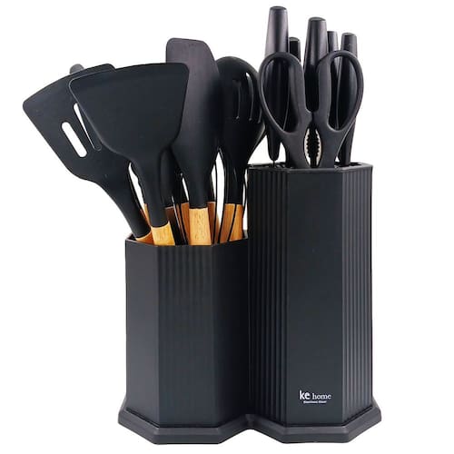 Design sofisticado: Além de funcionalidade, o conjunto possui um design moderno. Proteção para panelas: Os utensílios de silicone evitam arranhões em panelas antiaderentes, ao contrário dos de metal. Variedade de peças: Inclui desde facas para diferentes cortes até utensílios de silicone, oferecendo versatilidade na cozinha. Materiais: É composto por utensílios de silicone, facas e tábua de corte. Suporte: O kit inclui um suporte para manter os utensílios organizados.