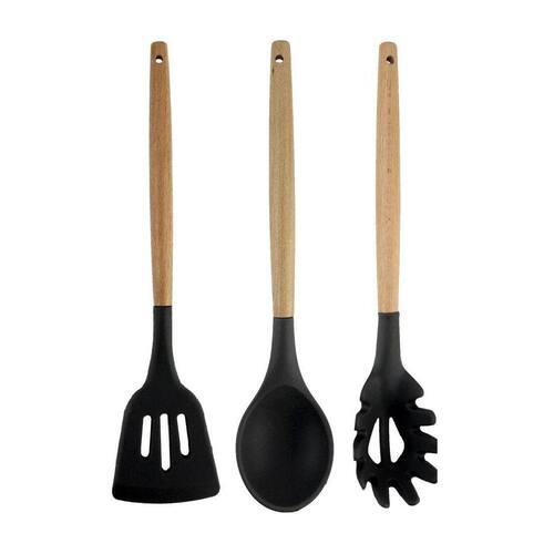 Kit Utensílios Silicone com Cabo de Madeira 3 peças - Preto 1 espátula Vazada Silicone com Cabo em Madeira Medida 31,5 x 7cm1 concha silicone com Cabo de MedeiraMedida 31 x 7,5 cm 1 pegador de Massas Silicone com Cabo de MadeiraMedida 31,4 x 6 cm Marca Clink